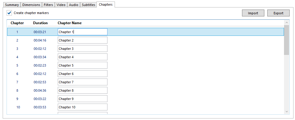 You can also import or export the set of chapter markers. HandBrake supports importing of CSV (Comma Separated Value) files.