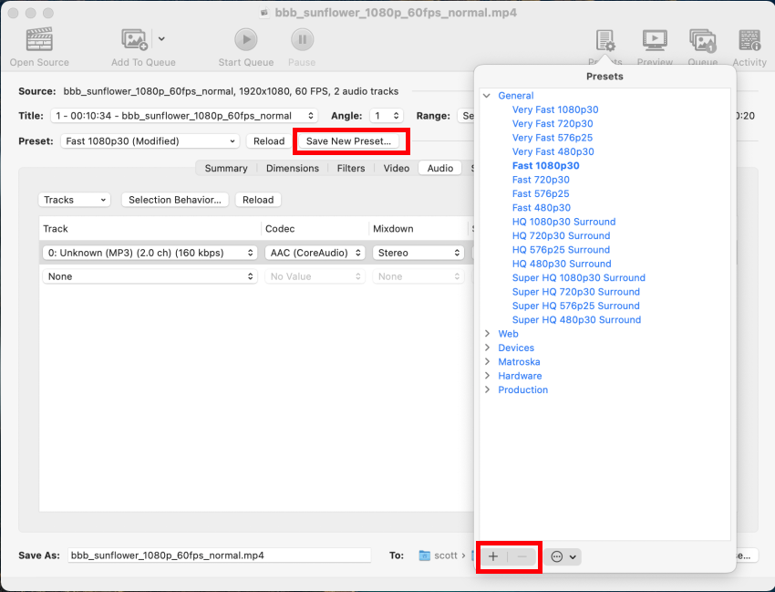 If you regularly use the same preset, you can make it the default preset that HandBrake starts with by selecting the “Make Default” (macOS) or “Set Current as Default” (Windows) option in the presets menu or by using the preset manager accessed via the toolbar.