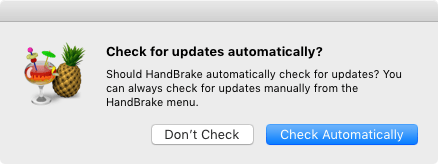 After you’ve installed and launched HandBrake more than once, it will ask whether you want to automatically check for updates. Select Check Automatically and HandBrake will offer to install future updates as they become available.