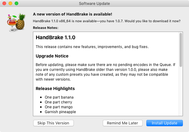 Before updating, please make sure there are no pending encodes in the Queue. If you are currently using HandBrake older than version 1.0.0, also make note of any custom Presets you have created, as they may not be compatible with newer versions.