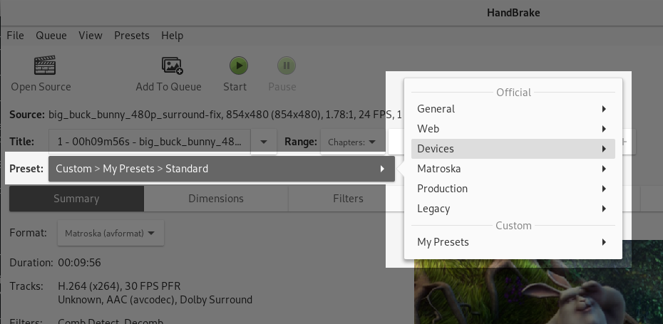 HandBrake liefert einige Voreinstellungen um dein neues Video für deine Geräte und Software ideal anzupassen. Falls du zum Beispiel eine Playstation 4 hast, könntest du die Playstation 1080p30 Surround Voreinstellung unter Geräte wählen.