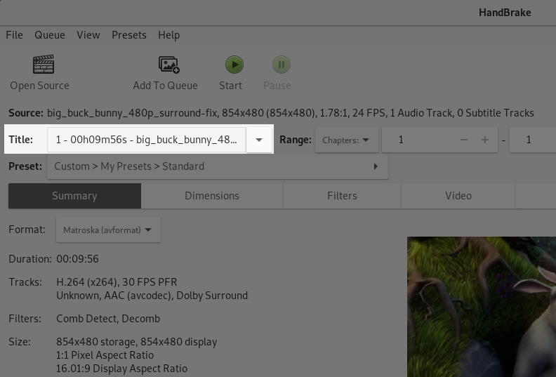 Manche Quellen können mehr als einen Videoclip enthalten, oder eine Kollektion von Titeln. Mithilfe von HandBrake’s Titel Selektion kannst du den Video Clip aussuchen den du verwenden möchtest.