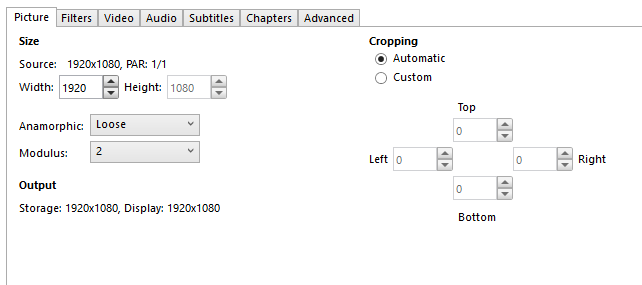 HandBrake’s auto-crop ist nicht perfekt. Es probiert dir einen Vorschlag für die Werte zu geben. Falls es deiner Meinung nach falsche Werte sind, was etwas unüblich ist, kannst du diese bearbeiten indem du die “Custom” Option wählst.
