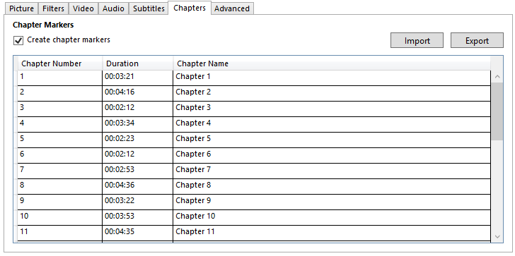 Du kannst zudem einen Satz an Kapiteln importieren oder exportieren. HandBrake unterstützt den Import von CSV (Command separated Values) Dateien.