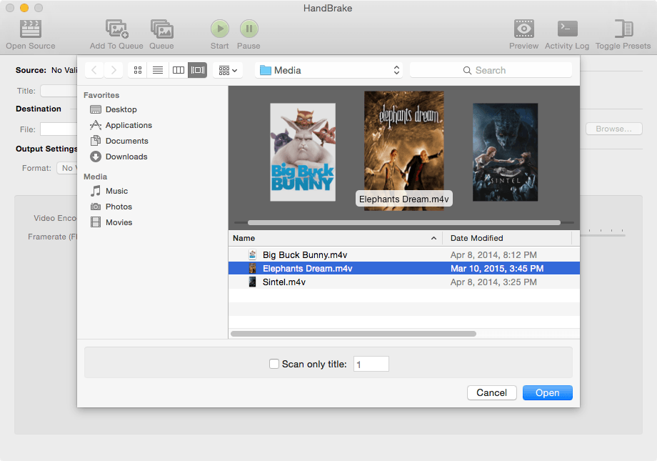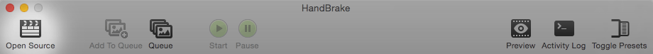By default, HandBrake presents the Open Source dialog on launch. It is also accessible from the Toolbar at the top of HandBrake’s main window.