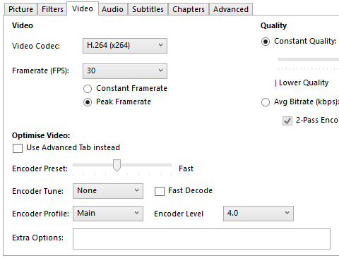 Settings play a large part in encoding performance. Most of the encoders expose many configuration options which allow you to tune the encoders. In HandBrake we’ve simplified this to a “Video Preset” slider. This offers a range of presets from Ultrafast to Placebo (which is very slow). This slider trades off speed vs quality and file size. Using faster presets and reduces quality OR increase file size. Using slower presets uses more complex algorithms to compress the video which takes more time offering an overall better result.