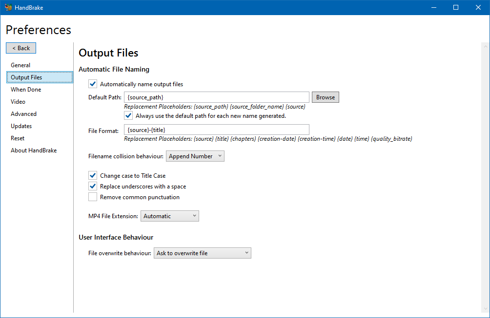 Here you can define the default path where output files will be stored, and the format the file name will take.