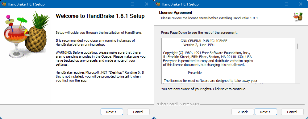If HandBrake is already installed on your computer, the installer will offer to remove the previous version before installing the current version. Select OK to proceed and review HandBrake’s license terms.