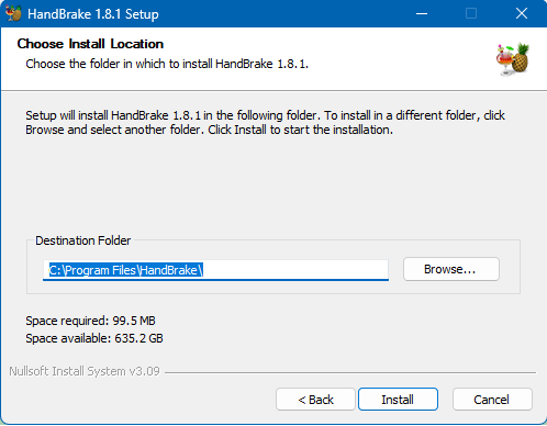 Next, the installer will ask you where you wish to install HandBrake. Unless you have a specific reason to change this, select Install to continue. Once the installation is complete, you may select Finish to exit the installer.